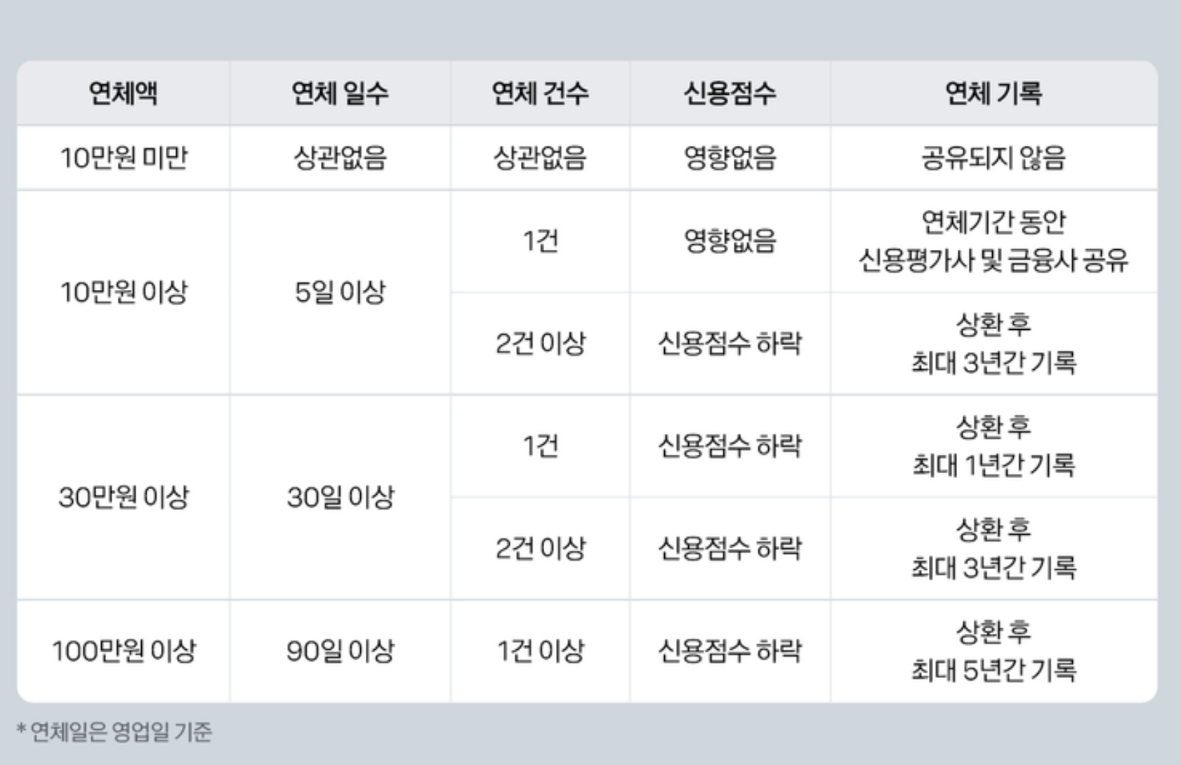 - 장기 연체: 90일 이상 → 신용정보원에 '연체 등록'