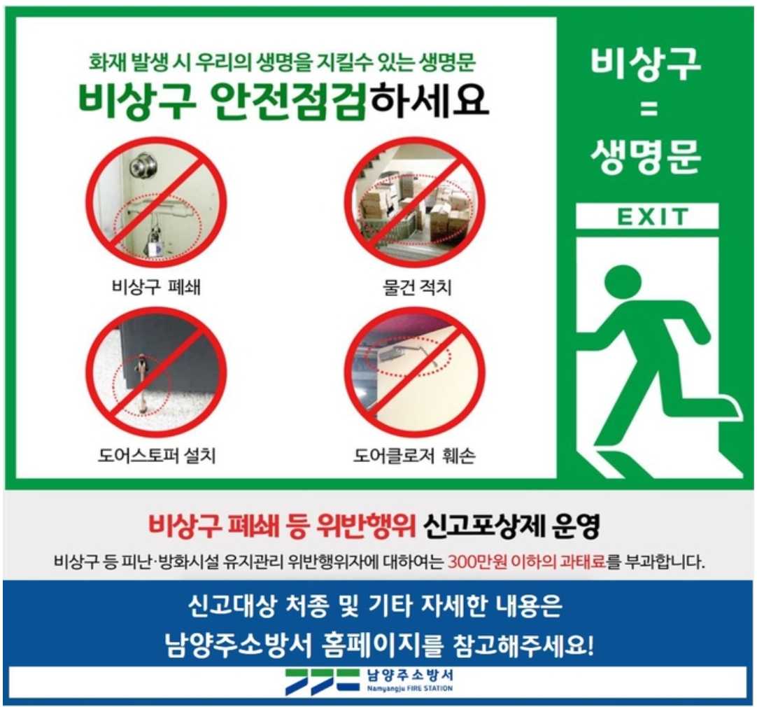- 온라인: 경기도소방재난본부 비상구 신고센터