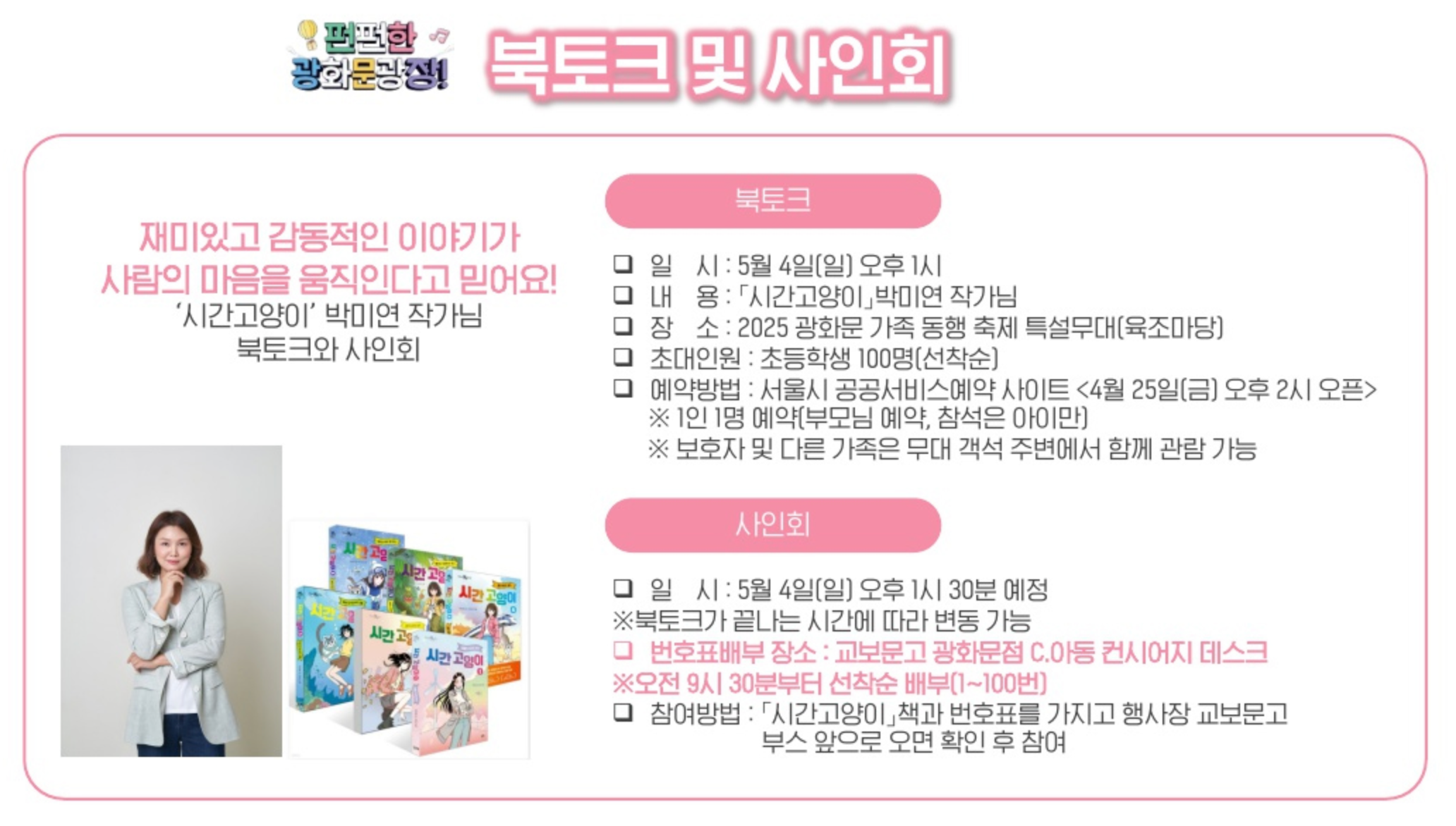 - 북토크 & 사인회: 「시간고양이」 박미연 작가와 만남 (5/4 오후 1시, 선착순 100명)