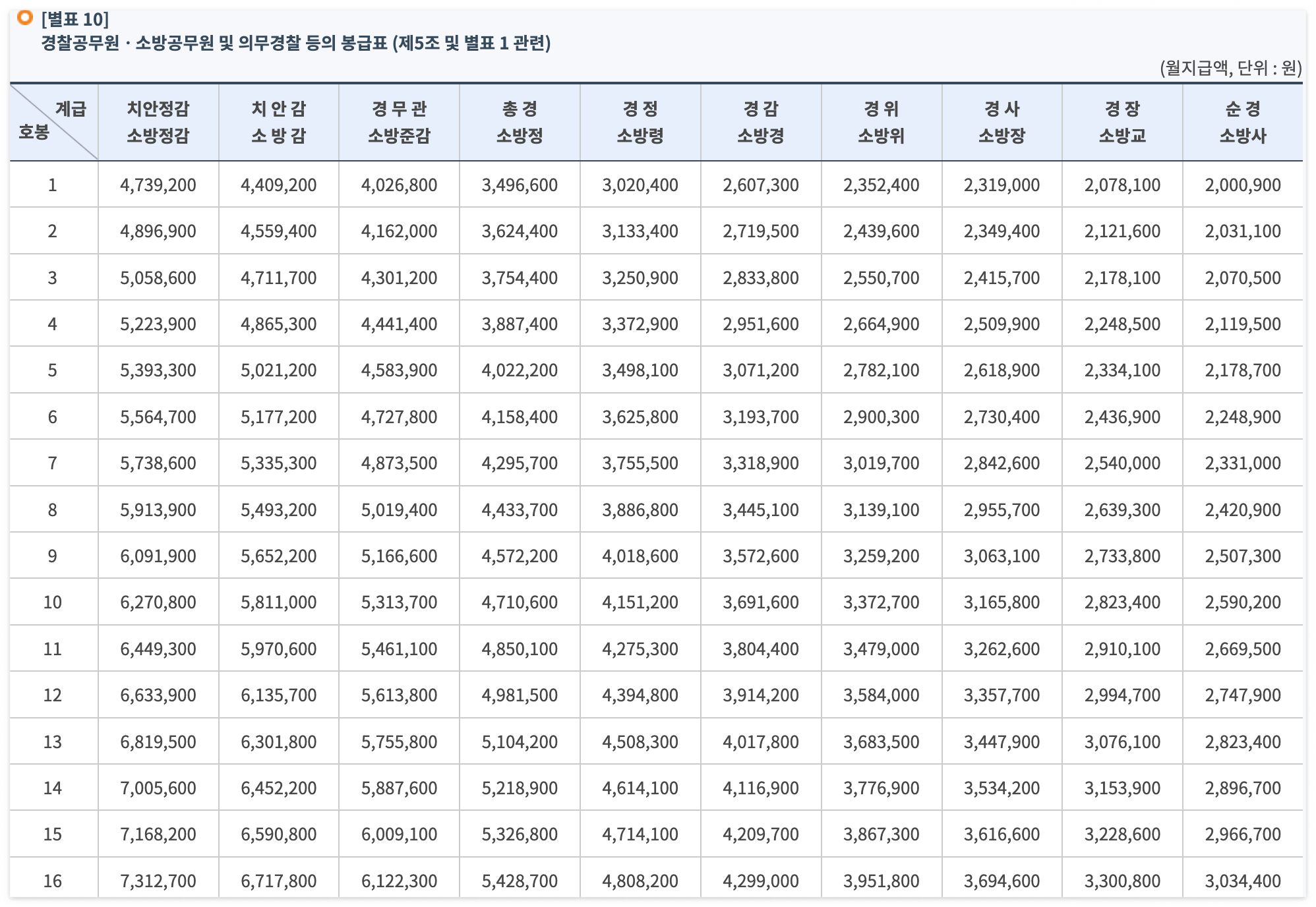 경감 | 10호봉 | 2,580,000 | 1,100,000 | 3,680,000 | 44,160,000 |