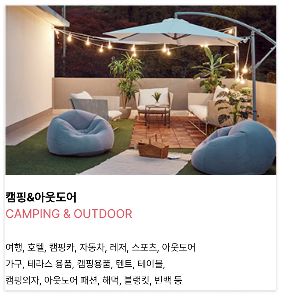 - 캠핑&아웃도어, 헬스&뷰티 등 다양한 라이프스타일 제품