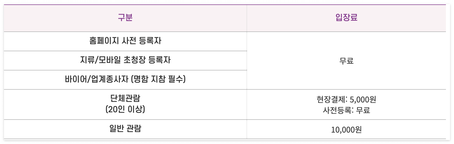 - 입장료: 사전등록자 및 초청장 소지자 무료 / 현장 등록 시 10,000원