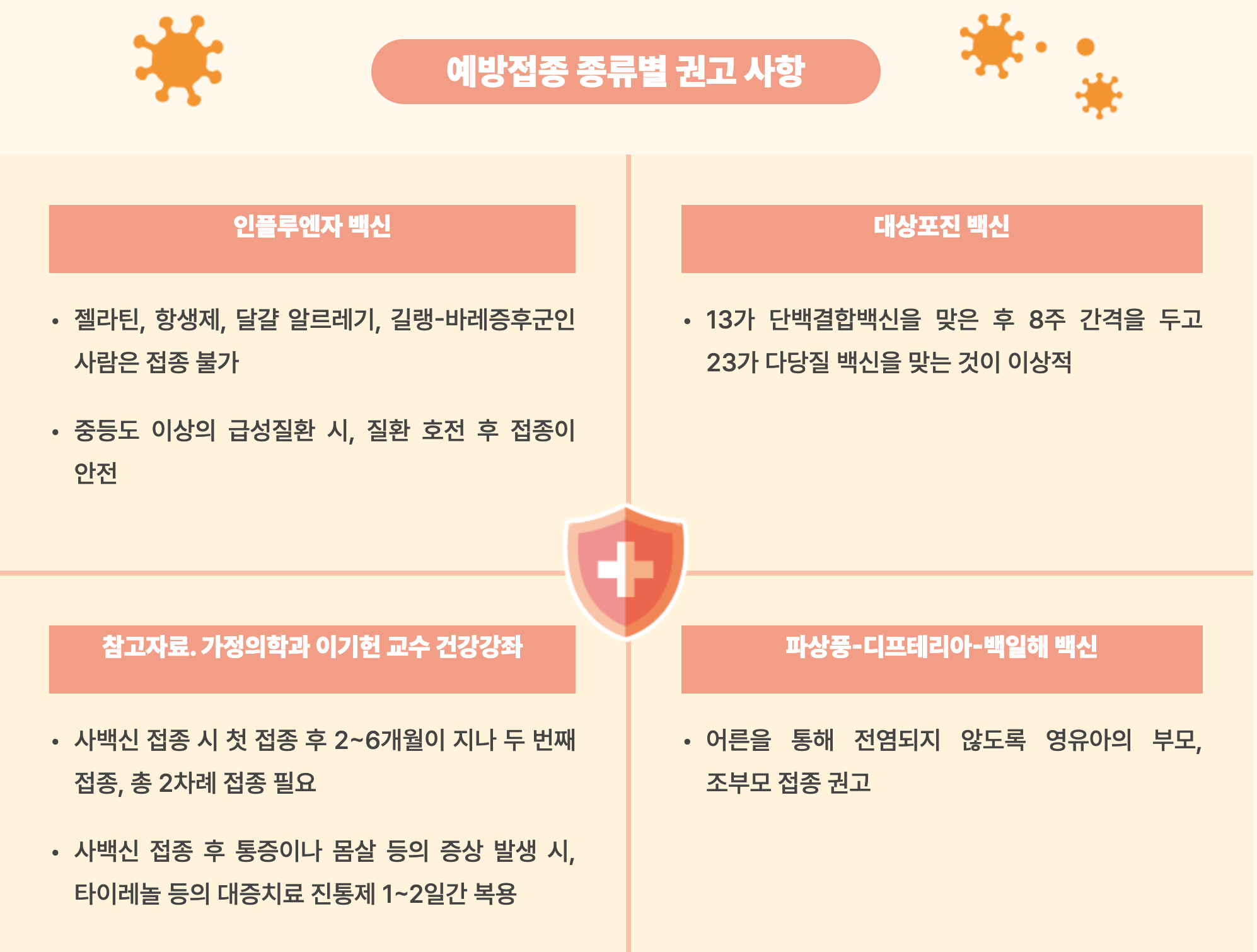 - 3. 인플루엔자(독감) 백신: 매년 가을, 고령자는 고용량 백신 고려.