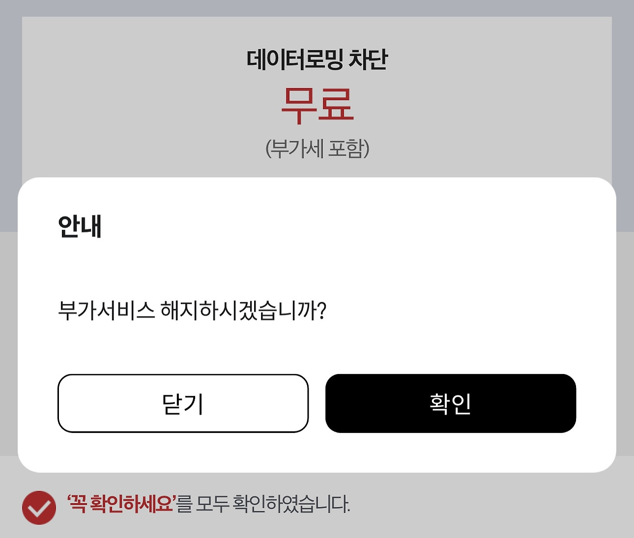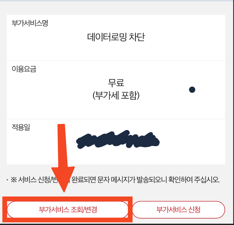 - 무료 부가서비스 항목에서 ‘음성/데이터 로밍 차단’ 항목 해지 클릭