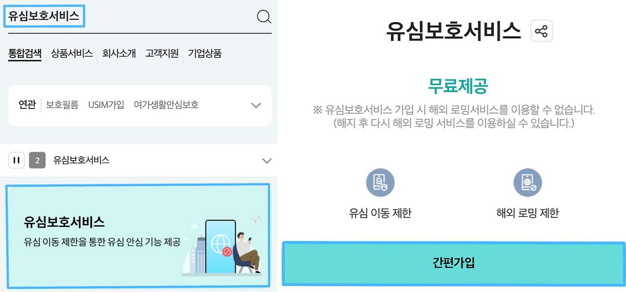 - 마이케이티 앱 로그인 → 검색창에 ‘유심보호서비스’ 입력 → 간편 가입 클릭 → 신청 완료